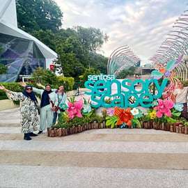 Nous traverserons ensuite le pont-jetée pour rejoindre l'île de Sentosa, où vous attend le tout nouveau Sensoryscape, un jardin nocturne surréaliste et multisensoriel avec des chemins éclairés par des LED, des sculptures lumineuses et des ambiances sonores. C'est l'une des meilleures nouvelles attractions gratuites de l'île, idéale pour la photographie de nuit.