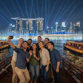 Après le spectacle, embarquez pour une croisière fluviale pittoresque à Singapour, en passant devant des ponts historiques et des quartiers animés au bord de l'eau. Lorsque le bateau entrera dans Marina Bay, vous assisterez à l'un des temps forts de l'excursion en regardant le spectacle Spectra Light & Water Show directement depuis l'eau. Cette perspective unique offre une vue imprenable sur les fontaines, les lasers et les reflets qui dansent à travers la baie, ce qui en fait un moment fort de la soirée.