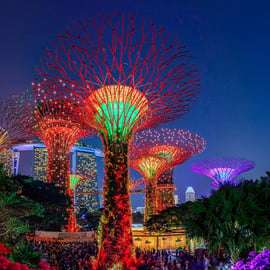Rendez-vous ensuite à Gardens by the Bay pour assister au spectacle enchanteur Garden Rhapsody à Supertree Grove. Observez les imposants Supertrees prendre vie dans un spectacle synchronisé de musique et de lumières, créant l'une des expériences nocturnes les plus appréciées de Singapour.