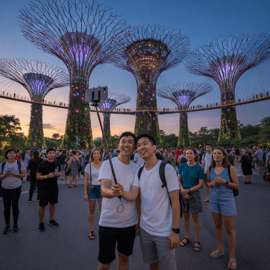 Après le dîner, poursuivez par une visite des Gardens by the Bay, où vous assisterez au spectaculaire spectacle de lumière Garden Rhapsody au Supertree Grove. À la tombée de la nuit, les imposants Supertrees prennent vie grâce à des lumières et de la musique synchronisées, créant l'un des spectacles nocturnes les plus magiques de Singapour.