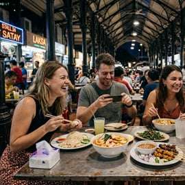 Pour compléter le repas, savourez des brochettes satay, un célèbre street food de Singapour composé de viande marinée grillée au charbon de bois et servie avec une sauce savoureuse. Ce dîner constitue une merveilleuse introduction à la culture des hawkers de Singapour et vous permet de profiter de la nourriture et de l'ambiance locale animée.