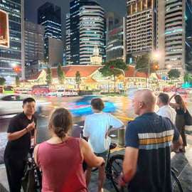 Parcourez le paysage urbain animé de Singapour à vélo au coucher du soleil, admirez les sites emblématiques et savourez un délicieux dîner de rue en plein air au marché historique de Lau Pa Sat lors de cette visite culinaire guidée à vélo.