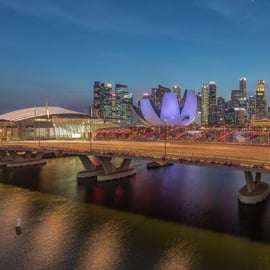 Votre chauffeur/guide vous conduira ensuite dans le quartier de l'Esplanade et du pont Helix. L'Esplanade, avec son architecture distinctive, et le pont Helix, légèrement incurvé, offrent une promenade pittoresque le long de l'eau, entourée de reflets et de vues nocturnes sur la ville.